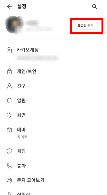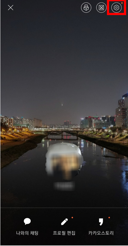 카카오톡을 실행해 주신 다음 본인의 프로필 화면으로 들어가십니다. 들어가시면 우측 상단에 설정으로 들어가는 버튼이 있습니다. 톱니바퀴 같이 생겼습니다.