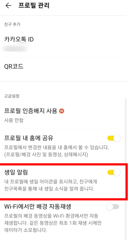 화면이 나오시면 프로필 관리 버튼을 눌러주시면 처음 화면과 같은 생일 알림 문구 화면이 똑같이 나오게 됩니다. 거기서 공개 설정으로 변경해주시면 추후 생일이 다가 왔을때 본인을 비롯한 다른 카카오톡 저장이 되어있는 분들을 모두 본인의 생일을 확인하실 수 있게 됩니다.